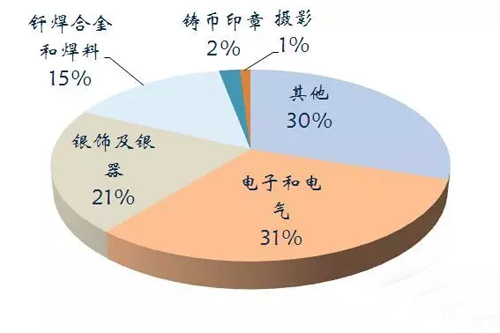 銀主要應(yīng)用于工業(yè)、醫(yī)學(xué)、首飾3個(gè)方面。我國銀的主要用于電子電器工業(yè)、焊接合金以及首飾加工等。2014年中國銀儲量4.3萬噸,產(chǎn)量4200噸。