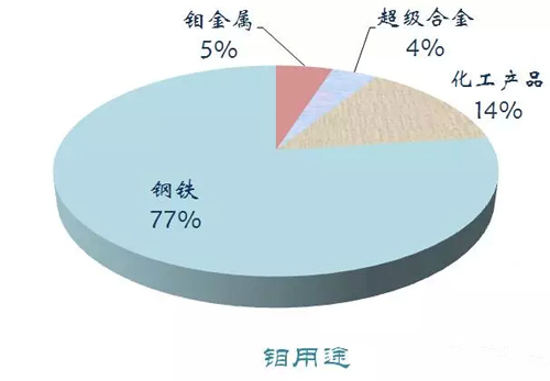 鋼鐵行業(yè)是鉬的主要消費(fèi)領(lǐng)域,其消費(fèi)量占中國鉬總消費(fèi)量的75%以上。2014年我國鉬儲量430萬噸,產(chǎn)量10萬噸。